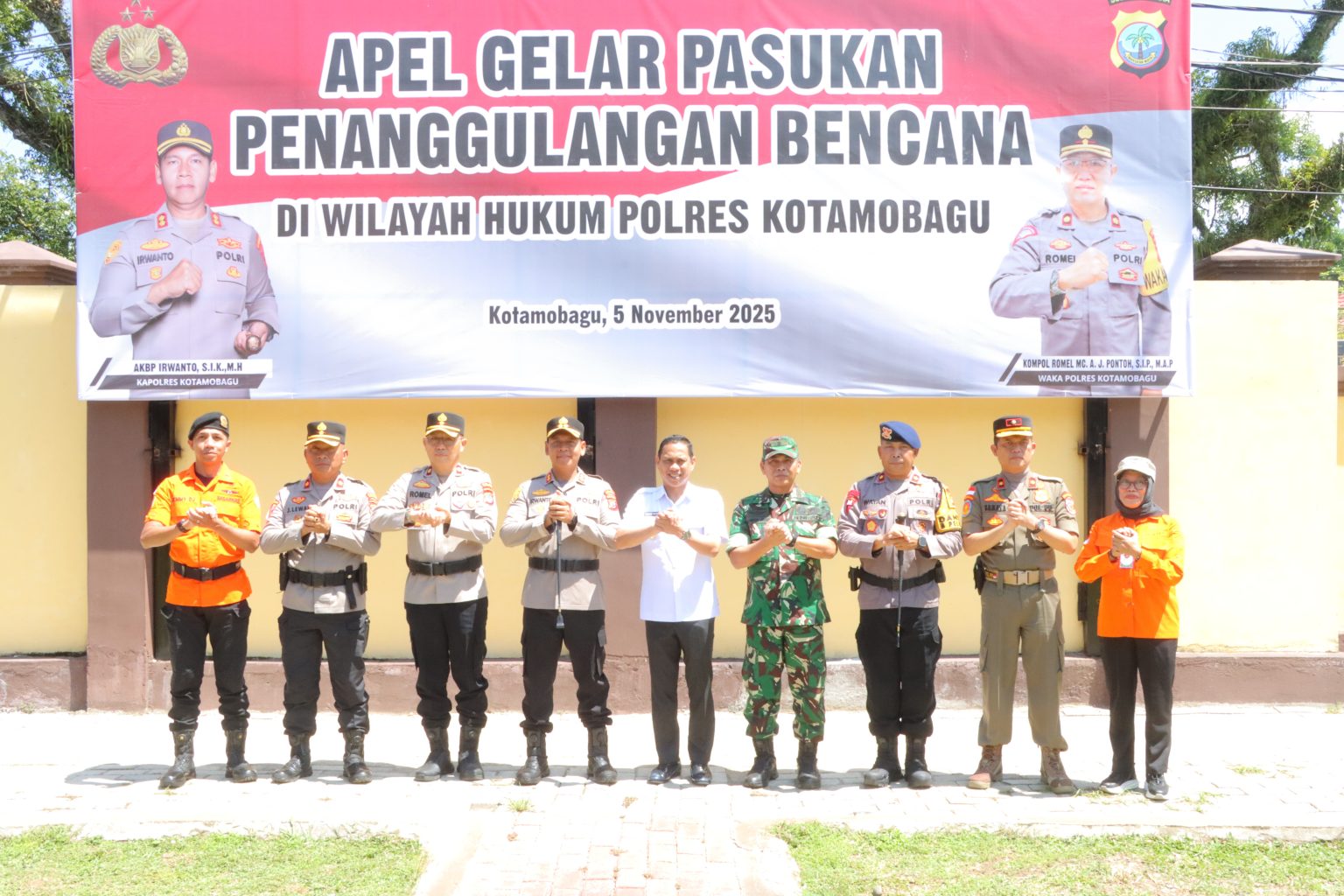 Apel dipimpin langsung oleh Kapolres Kotamobagu AKBP Irwanto, dihadiri oleh Walikota Kotamobagu dr. Weny Gaib Sp.M, perwakilan Forkopimda, dan berbagai unsur serta stakeholder terkait, mulai dari Kodim 1303 Bolmong, SAR Brimob Yon B Inuai, BPBD, Basarnas, Satpol PP, Tagana, Senkom, hingga relawan tanggap bencana.