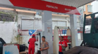 Personel Polsek Tikala melakukan pemantauan dan pengaturan arus lalu lintas di sejumlah SPBU, Senin (17/2/2025). selengkapnya