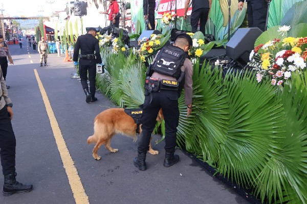 MANADO, Humas Polda Sulut – Unit K-9 Ditsamapta Polda Sulawesi Utara (Sulut) menurunkan anjing pelacak untuk melakukan sterilisasi lokasi kegiatan Tomohon International Flower Festival (TIFF) 2025, Sabtu (9/8) pagi.