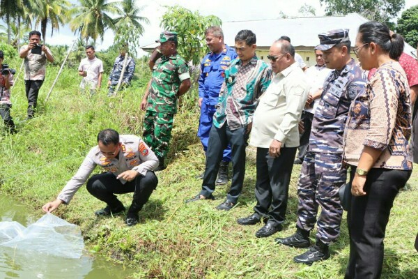 TALAUD, Humas Polda Sulut – Kapolres Kepulauan Talaud AKBP Arie Sulistyo Nugroho bersama Bupati Kepulauan Talaud Welly Titah serta Forkopimda melakukan penebaran 4 ribu benih ikan nila di kolam samping Mako Satuan Polairud Polres Kepulauan Talaud di Desa Kiama Kecamatan Melonguane, Kamis (8/1/2026).