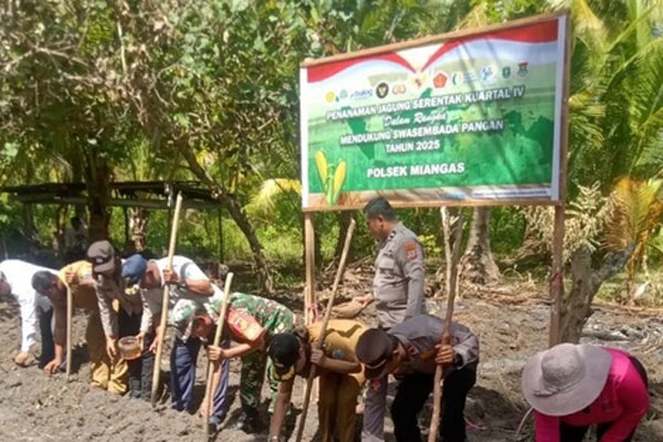Untuk mendukung swasembada pangan 2025, Polsek Miangas memprakarsai penanaman bibit jagung kuartal IV, di lahan masyarakat Desa Miangas, Kecamatan Khusus Miangas, Kabupaten Kepulauan Talaud, Senin (20/10).