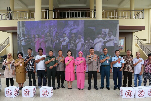 Penyerahan bantuan sosial secara simbolis dipusatkan di halaman Presisi Polda Sulut, Selasa (25/6/2024), dihadiri oleh Kapolda Sulut Irjen Pol Yudhiawan, Wakapolda Sulut Brigjen Pol Bahagia Dachi, Ketua Bhayangkari Sulut Ny. Yunita Yudhiawan bersama Pengurus, para PJU Polda, perwakilan Forkopimda Sulut, tokoh agama, tokoh masyarakat dan perwakilan elemen masyarakat penerima bantuan.