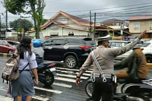 Sejumlah personel diterjunkan langsung ke titik-titik strategis yang rawan kemacetan, termasuk di kawasan sekitar Pasar Unyil. Selain mengatur ritme kendaraan, petugas juga tampak sigap memberikan pelayanan humanis dengan membantu anak-anak sekolah menyeberangi jalan.