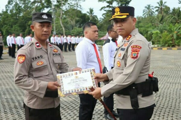 MITRA, Humas Polda Sulut – Kapolres Mitra AKBP Handoko Sanjaya memberikan penghargaan kepada enam personel yang dinilai memiliki dedikasi dan prestasi luar biasa dalam menjalankan tugas.