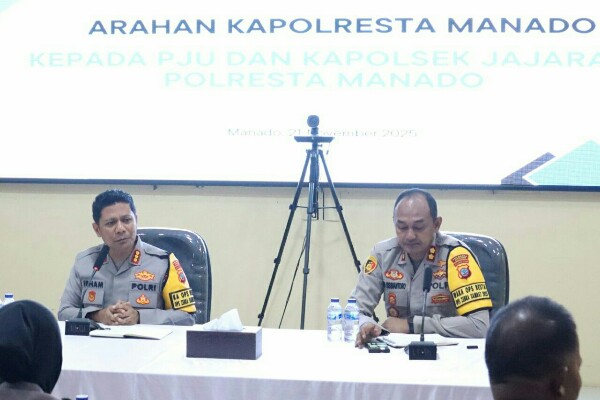 MANADO, Humas Polresta Manado – Kapolresta Manado Kombes Pol Irham Halid memberikan arahan kepada para Pejabat Utama (PJU) dan Kapolsek jajaran dalam kegiatan internal yang digelar di Mapolresta Manado, Jumat (21/11/2025).