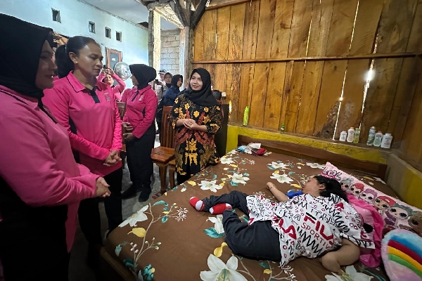 Ketua Umum Bhayangkari yang juga istri Kapolri, Juliati Sigit Prabowo mengunjungi anggota Polsek Baruga, Kendari, Sulawesi Tenggara, Aiptu Heri Santoso dan anaknya Yunita Sulistyawati yang tengah terbaring sakit, Rabu (16/10/2024).