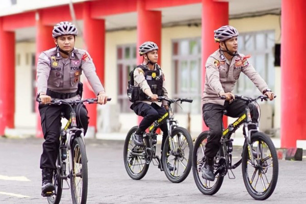 Personel pos pengamanan (Pospam) terpadu Megamas Manado melaksanakan patroli bersepeda, di kawasan setempat, pada Kamis (26/12/2024).