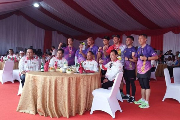Mereka kompak mengenakan seragam olahraga berwarna merah dan putih. Sejumlah pejabat tinggi TNI dan Polri terlihat berfoto bersama dengan Panglima TNI dan Kapolri.