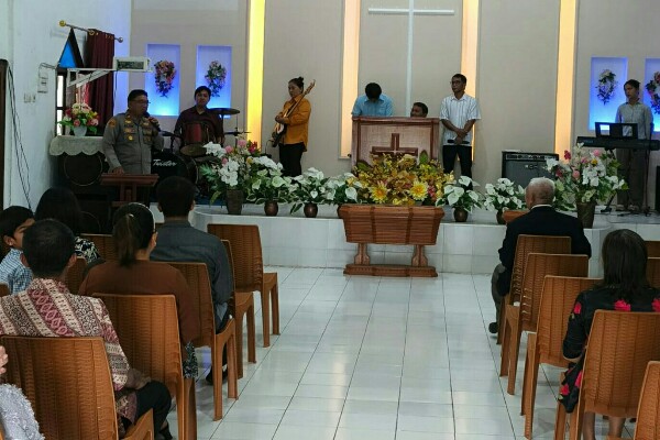 Ibadah yang dimulai pukul 09.30 WITA tersebut dipimpin oleh Pdt. Doni Turangan, S.Th. Di sela-sela rangkaian ibadah, Iptu Alen diberikan kesempatan untuk memperkenalkan diri sekaligus menyampaikan pesan-pesan Keamanan dan Ketertiban Masyarakat (Kamtibmas).