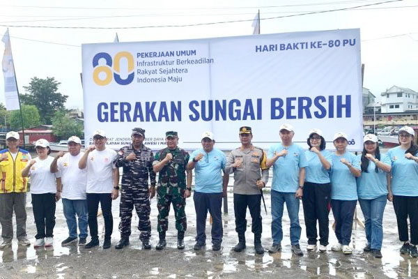 Personel Polresta Manado bersama unsur TNI, pemerintah, komunitas peduli lingkungan, masyarakat, dan pihak lainnya mengikuti kegiatan Gerakan Sungai Bersih dalam rangka memperingati Hari Bakti ke-80 Pekerjaan Umum (PU).