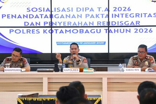 KOTAMOBAGU, Humas Polda Sulut – Kapolres Kotamobagu AKBP Irwanto memimpin kegiatan sosialisasi DIPA Tahun Anggaran 2026, penandatanganan Pakta Integritas, serta penyerahan Rencana Distribusi dan Penggunaan Anggaran (Rendisgar) Polres Kotamobagu Tahun 2026. Kegiatan tersebut berlangsung di Aula Polres Kotamobagu, Senin (12/01/2026).