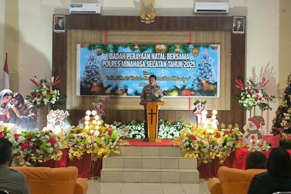 Ibadah Natal dipimpin oleh Pdt Rivke Tiwa bersama Pdt Jeivi Simbar dari jemaat GMIM Setia Kudus Pondang, dihadiri oleh Kapolres Minahasa Selatan AKBP David Candra Babega, Pejabat Utama (PJU) Polres, Perwira dan seluruh Personel Polres Minahasa Selatan yang beragama Kristiani, beserta keluarga.