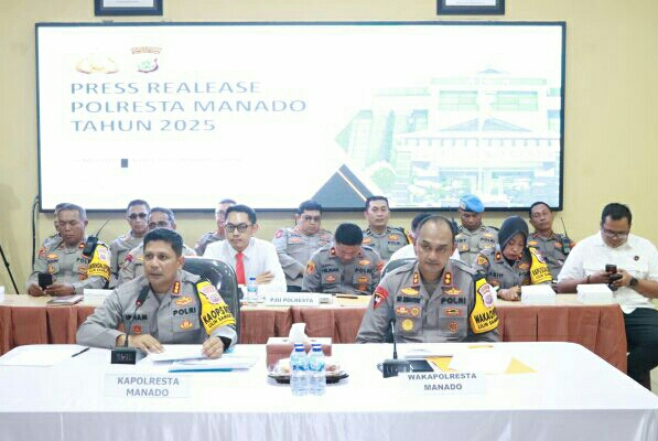 MANADO, Humas Polda Sulut – Kapolresta Manado Kombes Pol Irham Halid didampingi Wakapolresta Manado AKBP Eko Sisbioantoro menyampaikan rilis akhir tahun 2025 Polresta Manado, Rabu (31/12/2025)