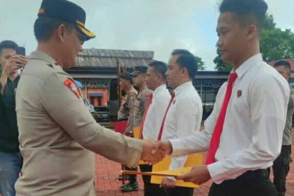 MANADO, Humas Polda Sulut – Kapolres Tomohon AKBP Lerry Tutu memberikan reward atau penghargaan kepada sejumlah personel berprestasi, yang diserahkan saat apel pagi di Mapolres Tomohon, Senin (6/5/2024).