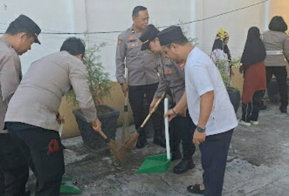 Kegiatan dipimpin langsung oleh Kapolres Bitung AKBP Albert Zai. Bersama para Pejabat Utama (PJU) dan personel lainnya, mereka turun ke lapangan untuk membersihkan area halaman masjid.